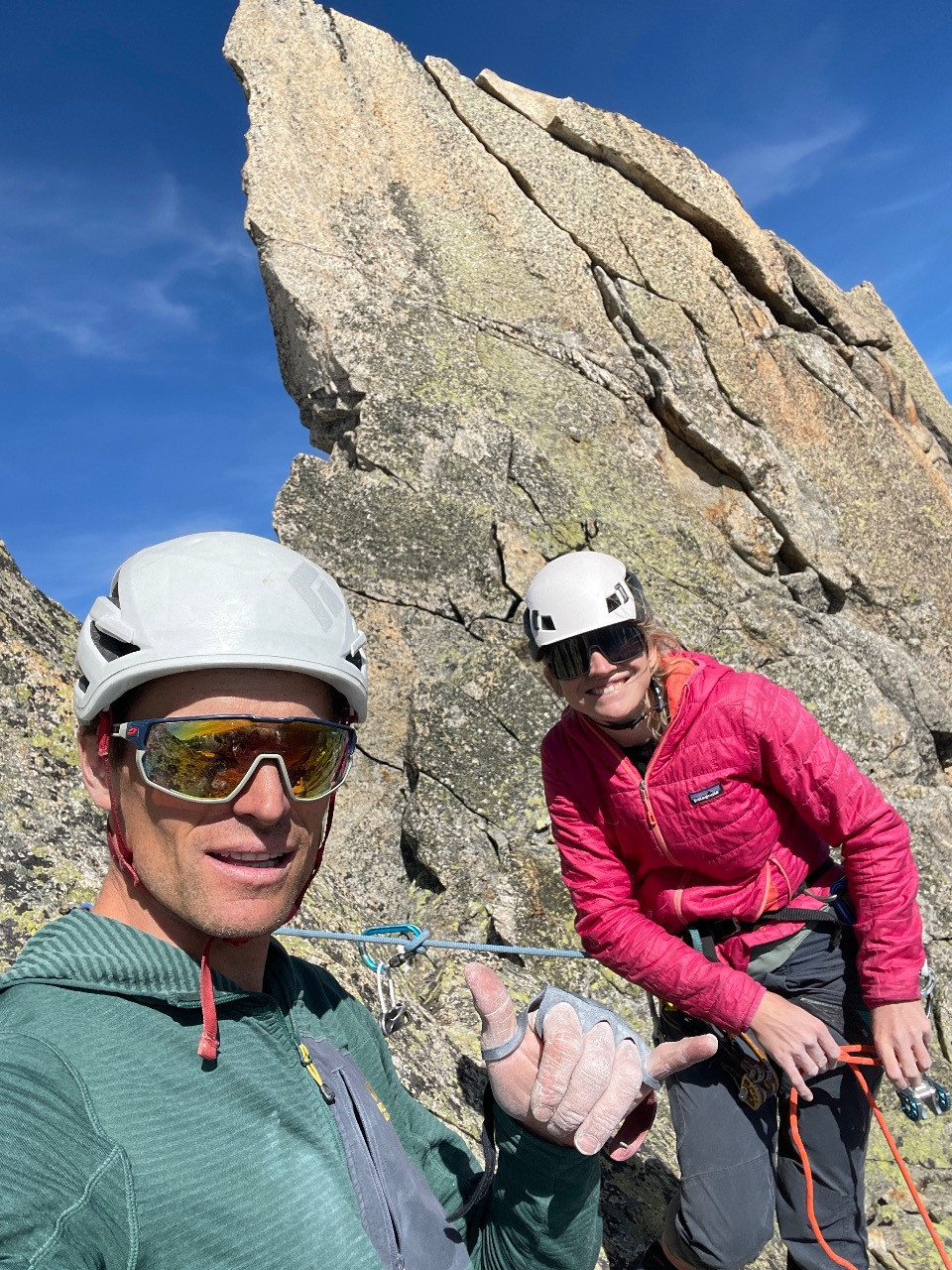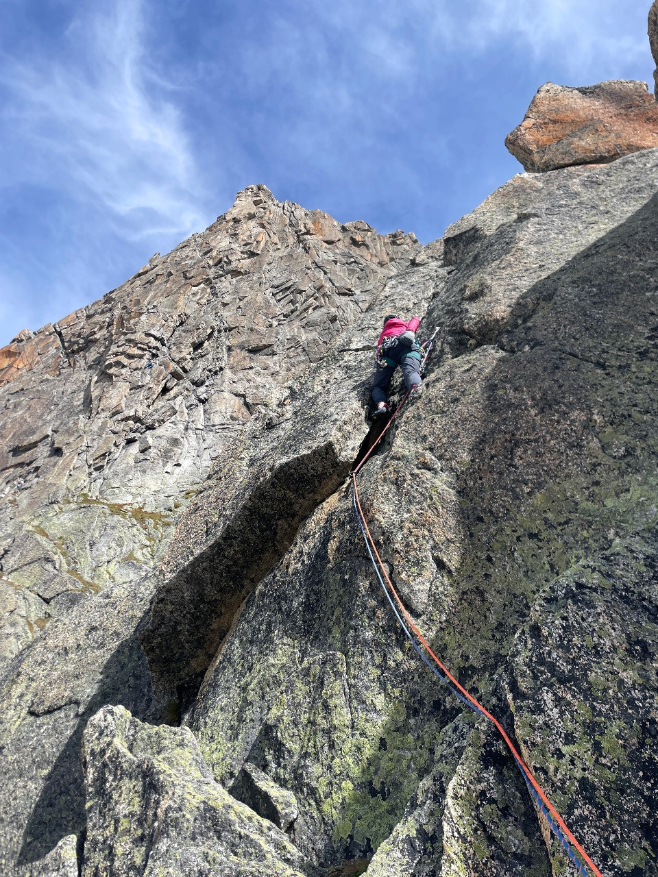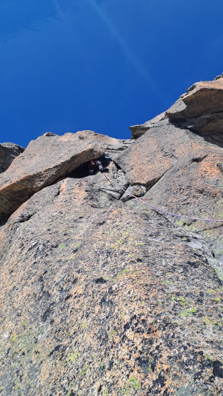 10Sl. 6b.: Für meinen Geschmack die beste Seillänge der Route. Sehr abwechslungsreich mit Rissen und einer Riesenschuppe, welche zum Verweilen einlädt. Die Schlüsselstelle bildet eine kurze steile Stelle an einer abdrängenden Piazschuppe, welche mit Cam3 solid abgesichert werden kann. Leider befindet sich der Schlussstand nicht ganz am Top, sondern 2m unterhalb davon. Schade…