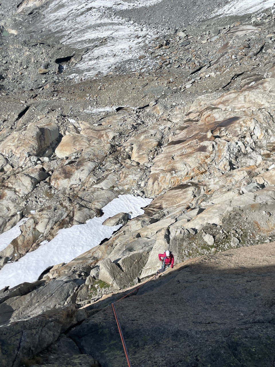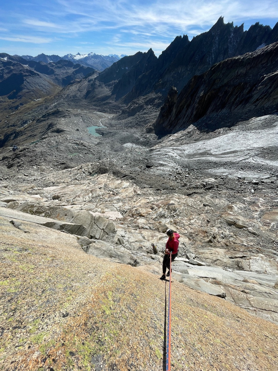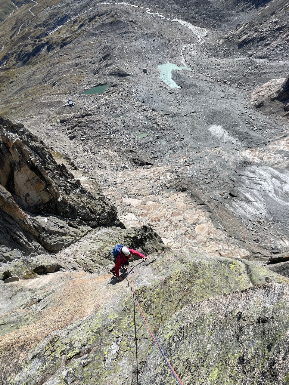 Risskletterei in der ersten Seillänge. Eindrücklich und traurig zugleich, wie schnell der Gletscher verschwindet.